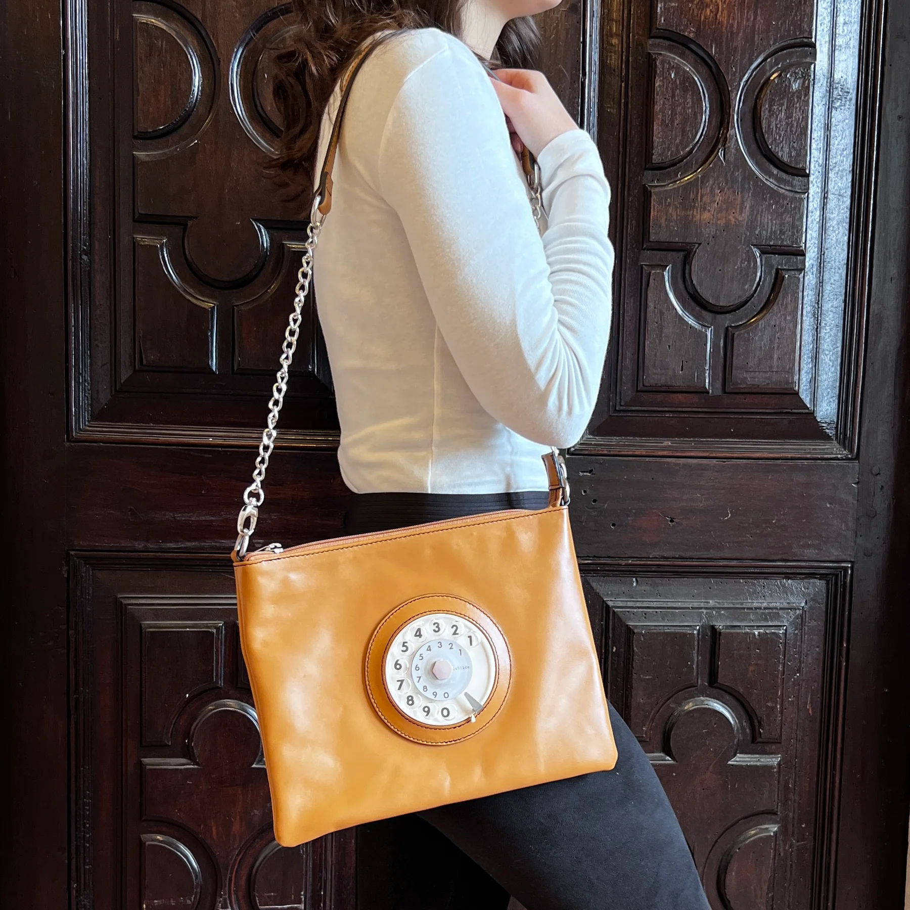 – La tracolla in pelle e catena, è removibile! Potrai portarla a mano se preferisci.