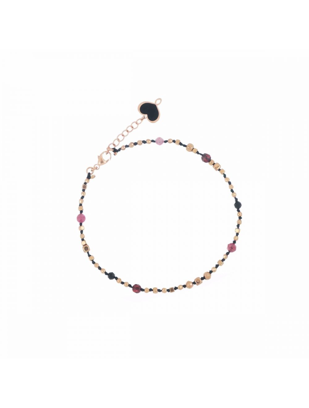 Bracciale con pietre di Ematite, Spinello nero, Tormalina rosa e Granato rosso realizzato in argento 925 con galvanica oro rosa ad alto spessore e resistenza.