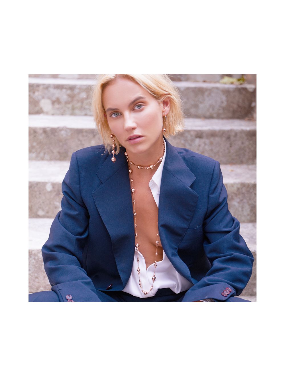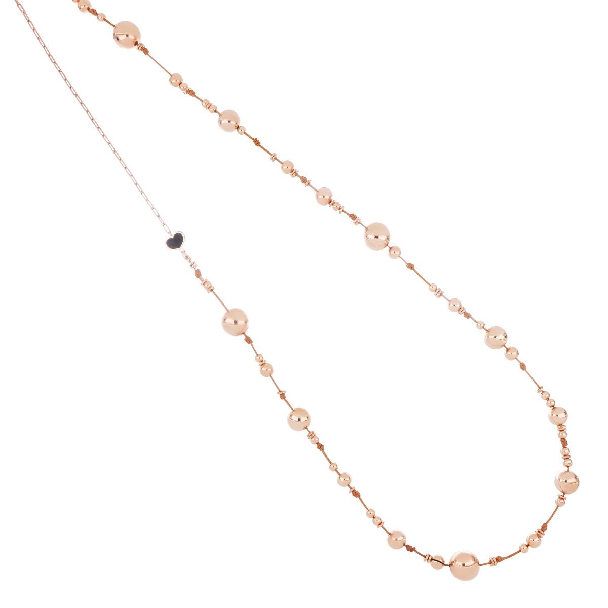 Collana di filo di nylon beige realizzata in argento 925 con galvanica oro rosa ad alto spessore e resistenza con sfere mondi di varie dimensioni.