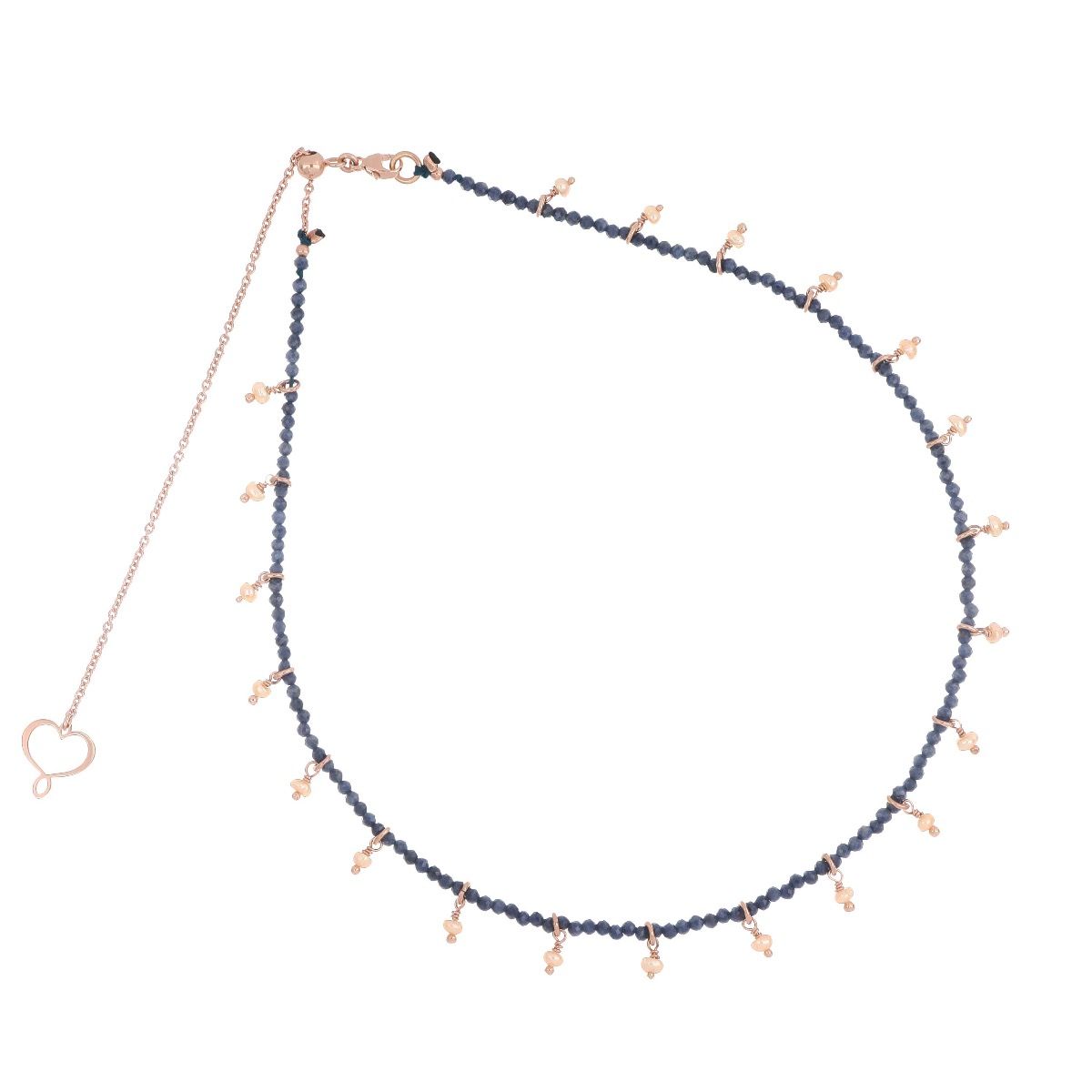 Girocollo chocker con pietre di Zaffiro e gocce di Perla pendenti realizzato in argento 925 con galvanica oro rosa ad alto spessore e resistenza.