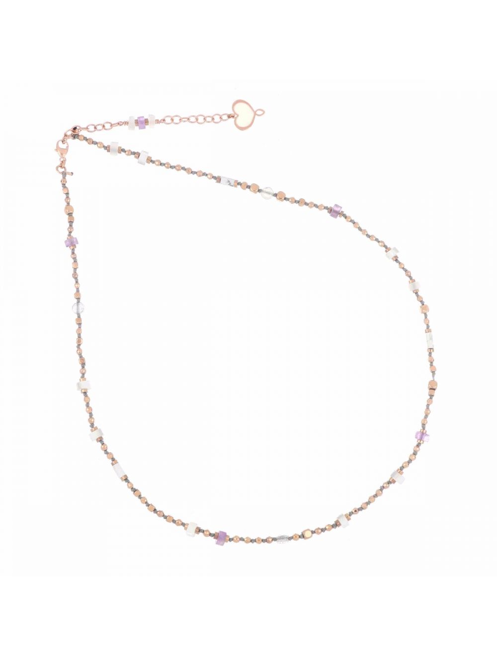 Girocollo con pietre di Ematite, Ametista viola, Madreperla bianca, Aulite bianca e Labradorite bianca realizzato in argento 925 con galvanica oro rosa ad alto spessore e resistenza.
