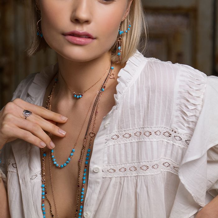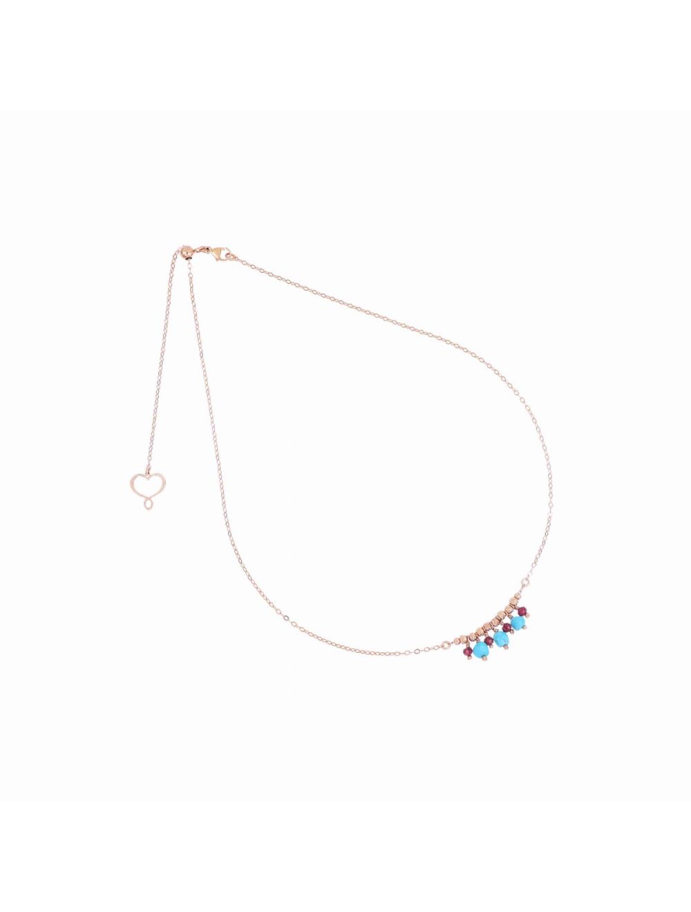 Girocollo realizzato in argento 925 con galvanica oro rosa ad alto spessore e resistenza con sfere decorative e pietre di Granato rosso e Turchese pendenti.